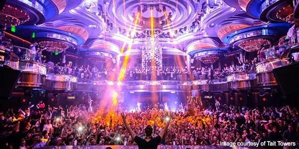 Unoszący się cztery piętra nad parkietem klubu Omnia żyrandol skąpany w promieniach tęczowego światła stanowi przykład „architektury kinetycznej” — jego pierścienie unoszą się, opadają i nachylają w rytm światła i muzyki.